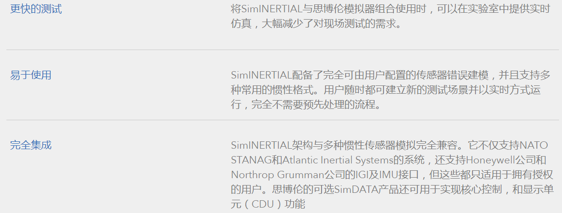 SimINERTIAL產品包增強了思博倫模擬系統的能力,使之能夠模擬多種類型集成式GPS/慣性 (IGI)導航傳感器(亦稱為EGI)的慣性測試輸入,還可以模擬慣性測量單元(IMU)的存在。這些產品包使IGI能夠在實驗室環境下接受動態測試,包括生成純慣性、純GPS或混合GPS/慣性位置解決方案,也可以對GPS接收機系統進行測試,同時還可以得到仿真IMU所提供數據的協助或輔助。