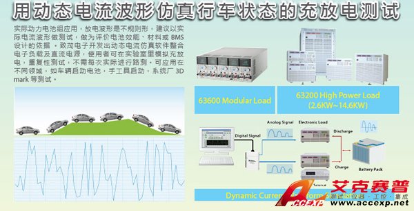 實際動力電池組應用,放電波形是不規則形,建議以實際電流波形做測試,做為評價電池效能、材料或BMS 設計的依據 。致茂電子開發出動態電流仿真軟件整合電子負載及直流電源,使用者可在實驗室里模擬充放電,重復性測試,不需每次實際進行路測。可應用在不同領域,如車輛啟動電池,手工具啟動,系統廠3D mark 等測試。