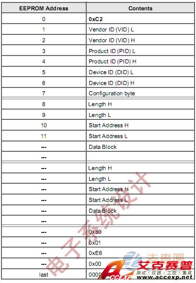 我們按照圖7所示的Cypress文檔提供的寄存器配置格式,配置固件為啟動時斷開USB連接,并將I2C時鐘設置為400KHz(將地址7數據修改為“0x41”)。
