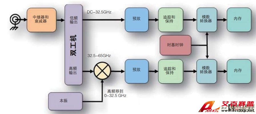 Martin詳細描述了之前的一些技術方案:“為了拓展帶寬,時間隔行掃描是一種常用技術。隨著采樣率的提高,隨機噪聲會均勻分布到新的內(nèi)奎斯特帶寬上。泰克的競爭對手在高帶寬示波器上采用數(shù)字帶寬隔行掃描,對于示波器設計人員來說,其主要優(yōu)勢是每臺ADC的采樣率只需大于總帶寬。但是這種設計面臨許多挑戰(zhàn)。一旦采集結(jié)束,數(shù)據(jù)放入波形內(nèi)存,那么必須使用DSP把上方頻段上變頻回到原始頻率范圍。恢復兩個‘一半’頻譜、重建波形非常復雜。由于路徑并不是完全一樣,因此必須在抵消中補償這些差異,抵消則是DSP的一部分。此外,由于兩個‘一半’頻譜中使用急劇的帶通濾波器,因此恢復頻譜的具體中心存在問題。在重復區(qū)域可能有平坦度問題,在該點上相位線性度也有問題。噪聲PSD會均勻分布在采樣通道的內(nèi)奎斯特帶寬上。事實上,使用頻率交織時,噪聲會提高,而且沒有在保持帶寬不變的情況下去降低噪聲的機會。”