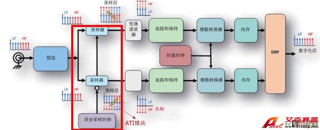 ATI中完全對稱的路徑實現(xiàn)理想的性能匹配;每條路徑數(shù)字化整個信號,而不只是一半;重建增加了兩份整個信號,可以除以2進行平均,使噪聲下降3dB。Martin對ATI的原理進行了細致的解釋:“在異步時序交織(ATI)技術中,預采樣器作為諧波混頻器。框圖如下圖所示。需要說明的是:路徑是對稱的,ATI中使用兩個ADC采樣整個頻譜,信號的整個帶寬都被應用到兩個ADC,這樣,噪聲的功率譜密度均勻分布到總采樣率中(每個ADC采樣率的2倍),結(jié)果,通帶中的整體噪聲要低于類似頻率交織結(jié)構中的噪聲。這種設計采用預采樣器,故意對輸入信號進行次采樣,從而產(chǎn)生假信號,或把頻譜成分的上半部分翻回到ADC的內(nèi)奎斯特帶寬。在最后組合步驟中,本質(zhì)上是和除以2,這一函數(shù)把輸入幅度返回原始值,另外會影響整個采集的噪聲平均,從而進一步降低測量通道的總噪聲。”