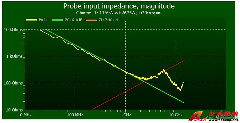 圖 1b Agilent PrecisionProbe 圖顯示了1169A 探頭放大器(配有 E2675A 探頭)的探頭輸入阻抗。理想探頭在所有頻率上均具備最大阻抗