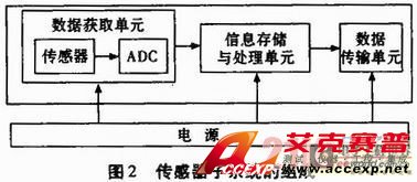 傳感器、感知對象和觀察者是傳感器網絡的三個基本要素。網絡中的傳感器節點(或稱為傳感器子系統)由電源、數據獲取單元、信息存儲與處理單元和數據傳輸單元構成,如圖2所示。電源為傳感器提供正常工作所必需的能源。數據獲取單元用于感知、獲取外界的信息,并將其轉換為數字信號。信息存儲與處理單元對數據獲取單元傳來的信息進行必要的處理、保存,數據傳輸單元負責與其他傳感器或接收發送器之間的通信。觀察者是傳感器網絡的用戶,是感知信息的接受者或任務管理者,觀察者可以是人,也可以是計算機或其他設備。