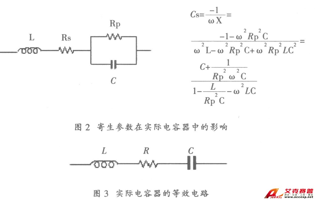 當我們進行電容器測量時, 必須考慮這些寄生量。阻抗測量儀器使用串聯模式(Cs-D、Cs-Rs)或并聯模式(Cp-D、Cp-Rp) 來測量電容。由于寄生參數的存在, 造成所顯示的電容值并不總是等于實際電容值C。例如, 當使用Cs-Rs 模式測量圖1 所示的電容器電路時, 顯示的電容值用圖2的復雜公式表示。只有當Rp 值足夠高, 并且L 的電抗可以忽略時, Cs 才等于Co。在高頻區能看到L 的影響, 在這種情況下就不能忽略L。對于高值電容器, 與C 值并聯的電抗遠低于Rp。對于低值電容器, Rp 本身就很高, 所以, 大多數電容可用圖3 表示。
