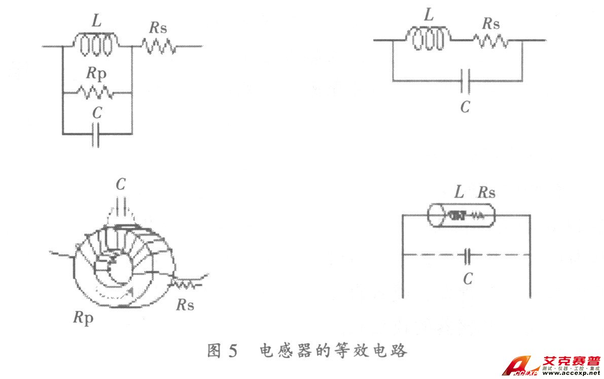 電感器由纏繞在磁芯上的導線構成, 其特性則由所使用的磁芯材料決定??諝馐菢嫵呻姼衅髯詈唵蔚拇判圆牧希?但為使電感器具有更高的電感量,經常用鐵、鐵氧體等磁性材料做磁芯。電感器的典型等效電路如圖5 (a) 所示, 圖中Rp 代表磁性的鐵耗, Rs 代表導線的銅耗, C 是繞線間的分布電容。對于低值電感應使用圖5 (b) 所示的等效電路。由于L 值很小, 繞組間的分布電容就成了主要的影響因素。