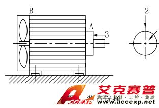 測(cè)振過(guò)程中,測(cè)點(diǎn)的選擇直接影響監(jiān)測(cè)結(jié)果,測(cè)點(diǎn)的選擇原則是:1、要盡量靠近振源;2、要盡量對(duì)準(zhǔn)振動(dòng)方向 3、便于多方位測(cè)量。例如,對(duì)旋轉(zhuǎn)機(jī)械而言,測(cè)點(diǎn)應(yīng)盡量靠近軸承。電機(jī)自由端一般有后風(fēng)扇罩,其測(cè)點(diǎn)選擇在風(fēng)扇罩固定螺絲有較好監(jiān)測(cè)效果,由于軸承振動(dòng)的方向是不確定的,通常可取軸向和徑向;如圖 3 所示,三個(gè)方向(軸向、垂直徑向、水平徑向)可確定測(cè)點(diǎn)的振動(dòng)情況:A 點(diǎn)測(cè)三個(gè)方向,B 點(diǎn)只能測(cè)二個(gè)方向,但軸向振動(dòng)的好壞可從 A 點(diǎn)反映出來(lái)。