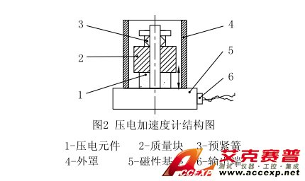 測(cè)振儀的種類很多,且有許多升級(jí)產(chǎn)品,如振動(dòng)分析儀、軸承分析儀、頻譜儀等,它們都是通過(guò)傳感器工作的,本文以加速度傳感器為例介紹測(cè)振儀的工作原理。測(cè)振儀工作時(shí)通過(guò)加速度傳感器采集測(cè)點(diǎn)的振動(dòng)值,分析計(jì)算后得出該點(diǎn)的加速度、速度和位移的峰值,這里筆者以壓電式加速度傳感器為例說(shuō)明其原理,見圖2。將傳感器磁性基座吸附在被測(cè)點(diǎn)表面,振動(dòng)引起質(zhì)量塊往復(fù)運(yùn)動(dòng),壓電元件受壓后產(chǎn)生壓電效應(yīng),電信號(hào)通過(guò)輸出端傳入主機(jī)。主機(jī)根據(jù)電信號(hào)的強(qiáng)弱及頻率特征首先計(jì)算出加速度,再根據(jù)加速度值一次和二次積分分別計(jì)算出速度和位移值。加速度、速度和位移分別從不同角度反應(yīng)振動(dòng)的優(yōu)劣。