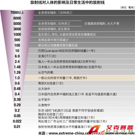 環(huán)境中本身存在的各種放射線輻射對人體是無害的,取決于包括大氣情況和地理位置各種各樣的因素,全世界核發(fā)輻射平均水平在約0.05 μSv/hr - 0.40 μSv/h之間,在中國,這個值是約0.13~ 0.25μSv/h左右。但是, 真正需要關注的問題不僅包括環(huán)境本底以外的輻射的強度 ,更值得注意的是輻射的累積效用。