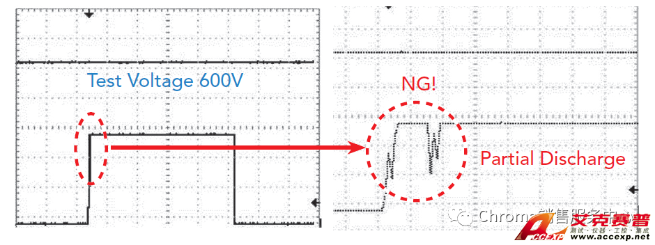 圖6 如果沒有監控波形,有任何PD或flashover發生使波形發生異常變化,都無法偵測到,Chroma 11210可監控電壓電流波形,在右圖可以觀察到有兩次PD現象發生,一次在CV模式、另一次在CC模式