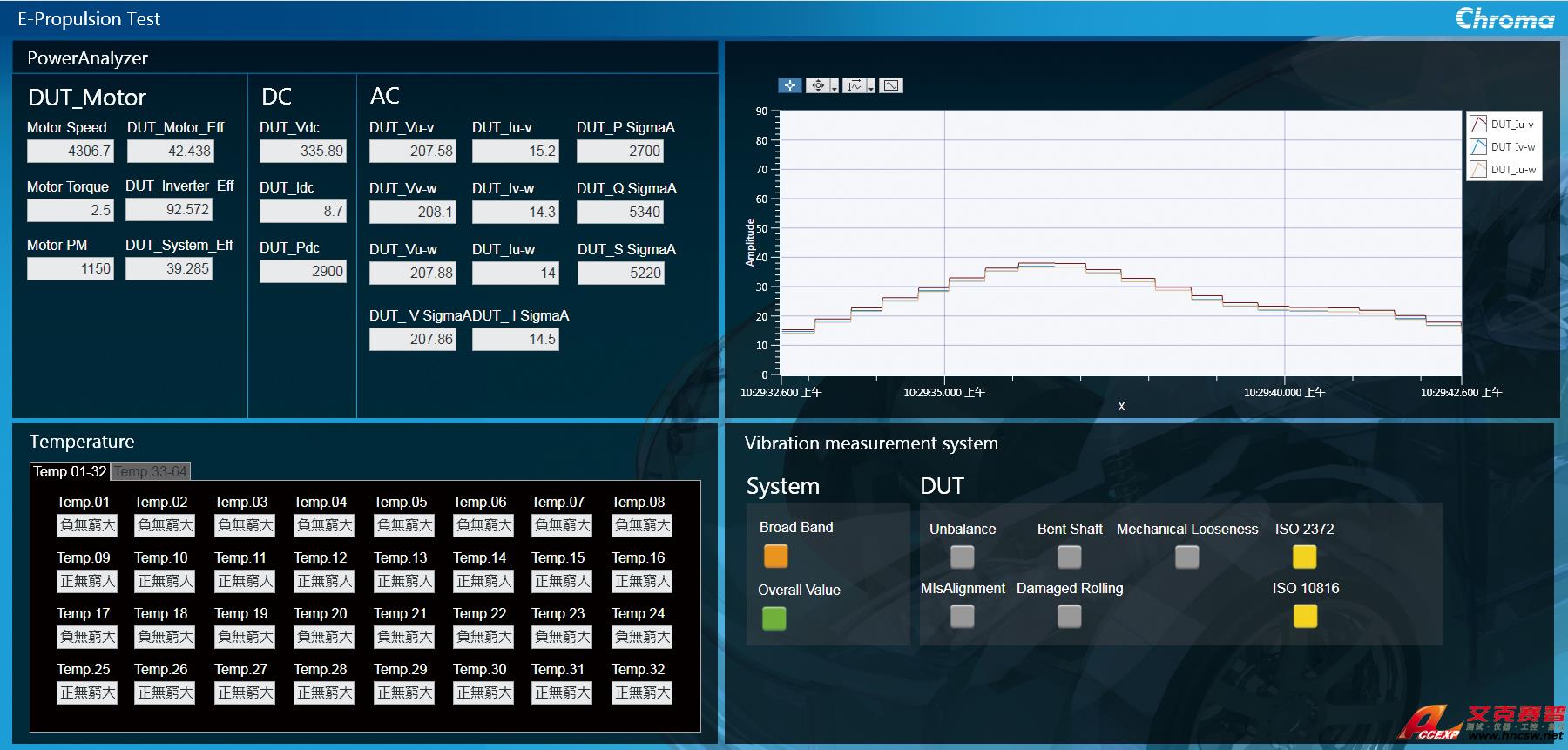 系統(tǒng)具有過(guò)流保護(hù)、過(guò)壓保護(hù)、欠壓保護(hù)、短路保護(hù)、電源缺相識(shí)別、系統(tǒng)溫度監(jiān)控等保護(hù)機(jī)制及過(guò)載響應(yīng)警告功能。其E-Propulsion Test 系統(tǒng)控制軟體具有載入DBC、關(guān)聯(lián)DBC、手動(dòng)控制與監(jiān)測(cè)資料等;測(cè)試介面可以實(shí)時(shí)顯示測(cè)試的瞬時(shí)值(電壓、電流、轉(zhuǎn)速、轉(zhuǎn)矩、輸入功率、輸出功率、效率、溫度等),并可按一定的時(shí)間(可設(shè)定) 采集數(shù)據(jù)。同時(shí)在測(cè)試過(guò)程中曲線(xiàn)繪制,產(chǎn)出報(bào)表,包含測(cè)試過(guò)程的曲線(xiàn)圖 (電壓、電流、轉(zhuǎn)速、轉(zhuǎn)矩、輸入功率、輸出功率、效率、溫度等)。系統(tǒng)采開(kāi)放式軟體管理架構(gòu),具有快速連結(jié)試驗(yàn)室相關(guān)測(cè)試及安全監(jiān)控之設(shè)備能力,并配置振動(dòng)監(jiān)控模組,同步監(jiān)控臺(tái)架與試驗(yàn)件運(yùn)行狀態(tài),借以完成一體化實(shí)驗(yàn)室整合及管理。