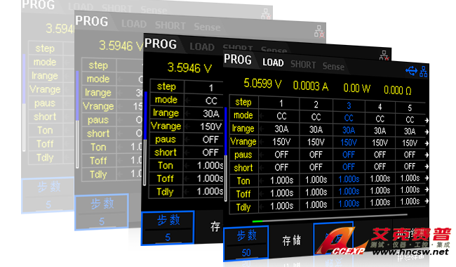Program 功能可以模擬CC、CV、CR、CP、LED五種測試。通過對列表步數、存儲、觸發等參數進行設定,負載可以模擬總共可以編輯10個測試文件,每個測試文件最多支持 50 步。