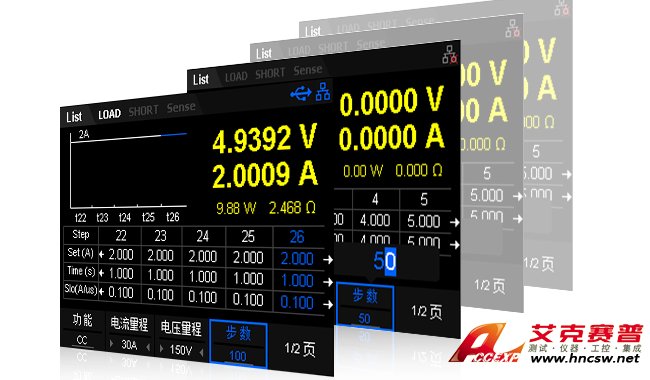 List 功能支持負載搭建多步的,定時的,不同帶載狀態的測試環境。通過編輯單步的步值、脈寬和斜率,負載可以生成多種復雜的序列組合,以滿足不同的測試需求。