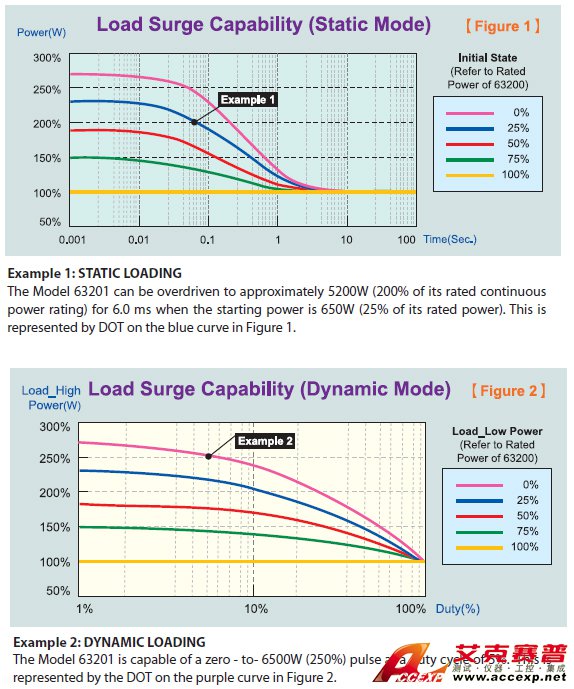 63200系列電子負(fù)載提供獨(dú)特的浪涌負(fù)載模擬能力,可使 63200系列電子負(fù)載功率瞬間過(guò)載2.7倍的額定功率。此特性 非常適合應(yīng)用在待測(cè)物進(jìn)行瞬間峰值功率的供給能力,電漿 電視(PDP)電源就是一種典型的應(yīng)用,其他應(yīng)用則例如電池的 3C放電、斷路器與無(wú)熔絲開關(guān)的過(guò)載(300%至1,000%)測(cè)試、 汽車引擎啟動(dòng)時(shí)的負(fù)載模擬及直流馬達(dá)的啟動(dòng)模擬等。