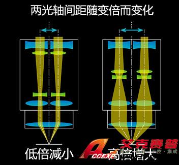 這是體式顯微鏡設(shè)計中的突破,完美變焦系統(tǒng)會在變倍過程中動態(tài)改變兩光軸間的距離。光軸間距離的變化可使每一倍率得到最大的進(jìn)光量,使兩個光路獲得無妥協(xié)的高變倍比與高分辨率,同時還可修正整個變倍范圍中的光學(xué)誤差。此外這一突破性的光學(xué)設(shè)計還可將以上所有的特性整合在緊湊的機身中,讓體式顯微鏡同時滿足人體工學(xué)設(shè)計的需要。
