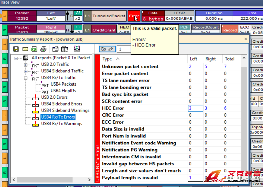 Teledyne LeCroy Voyager可以檢測(cè)并標(biāo)記實(shí)際的USB4,USB 3.2和PD協(xié)議錯(cuò)誤。在較低的層,將自動(dòng)檢查訓(xùn)練序列,SCR內(nèi)容和CRC值是否存在錯(cuò)誤。驗(yàn)證了配置數(shù)據(jù)包時(shí)序以及許多USB 3.2 / USB4邏輯層時(shí)序要求。