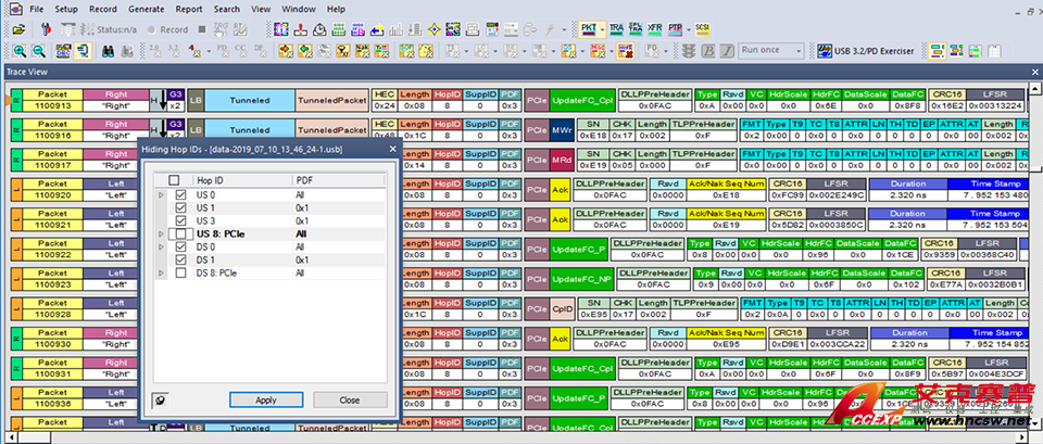 Voyager利用了傳奇的CATC Trace –行業(yè)實(shí)際的標(biāo)準(zhǔn)顯示,可以在單個(gè)視圖中顯示所有帶有標(biāo)簽和交錯(cuò)的數(shù)據(jù)包。邏輯USB4和邊帶通道的流量可以單獨(dú)進(jìn)行跟蹤過(guò)濾,搜索或?qū)С觥?梢詳U(kuò)展和折疊傳輸級(jí)別,以顯示包括所有有序集和控制數(shù)據(jù)包的邏輯層。在排隊(duì)時(shí),它將記錄并顯示所有寄存器的讀寫(xiě),以提供路由器和路徑配置空間的清晰畫(huà)面。HopID窗口允許基于Hopid和協(xié)議定義的功能(PDF)精確隱藏流量。隔離特定路徑上的流量可為網(wǎng)絡(luò)中的每個(gè)PCIe,USB或DP適配器提供完整配置順序的連貫圖。