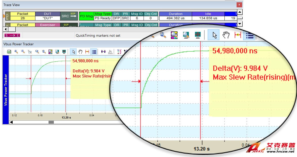 Voyager M4x Power Tracker選項(xiàng)以時(shí)間線格式監(jiān)視并以圖形方式顯示vBus電源和電流。電壓被同步以跟蹤事件,從而允許用戶(hù)驗(yàn)證協(xié)議和電氣層的電源狀態(tài)轉(zhuǎn)換。為CC和VCONN提供了獨(dú)立的功率圖,從而易于調(diào)試邏輯C型狀態(tài)轉(zhuǎn)換。
