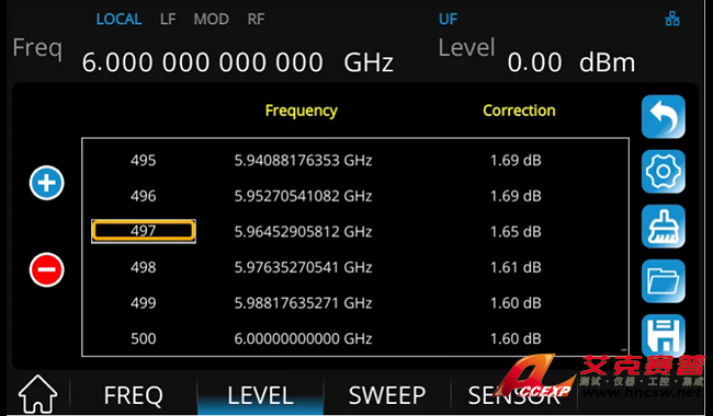 傳輸線越長(zhǎng),損耗越大,為了確保信號(hào)在經(jīng)過(guò)傳輸線到達(dá)被測(cè)設(shè)備(DUT)之前仍具有良好的平坦度,需進(jìn)行平坦度修正來(lái)補(bǔ)償傳輸線及開(kāi)關(guān)阻抗造成的傳輸損耗。RF系統(tǒng)中傳輸損耗與頻率有關(guān)(頻率響應(yīng)),鼎陽(yáng)SIGLENT SSG5060X射頻模擬/矢量信號(hào)發(fā)生器可配合主流功率計(jì),進(jìn)行多個(gè)頻點(diǎn)的平坦度修正,可方便修正線損。