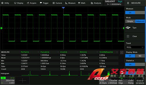 鼎陽SIGLENT SDS2202X Plus混合信號數字示波器參數統計功能可顯示任意參數的五種測量值:當前值、平均值、最小值、最大值、標準差;可同時測量統計12種不同的參數。直方圖統計可以直觀地顯示參數的概率分布情況;趨勢圖可反應參數隨時間的變化規律。