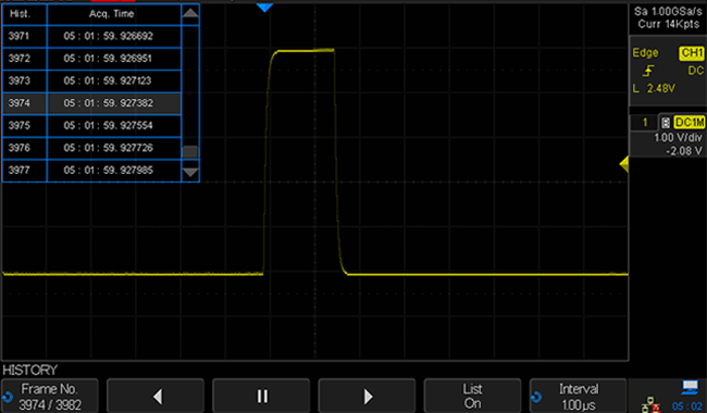 歷史波形自動實時錄制,隨時可回放歷史波形觀察異常事件,并通過光標或測量參數快速定位問題來源。