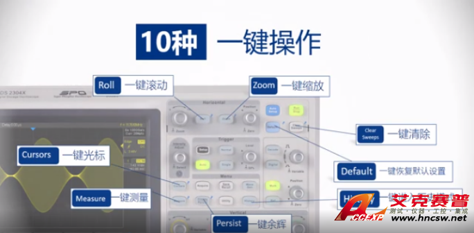 鼎陽SIGLENT SDS2302X熒光示波器把用戶最常用的功能做成了一鍵操作,共計10種,分別為一鍵縮放,一鍵滾動,一鍵打印,一鍵余輝,一鍵測量,一鍵進入歷史模式,一鍵恢復默認設置,一鍵光標,一鍵清除,一鍵自動捕獲。