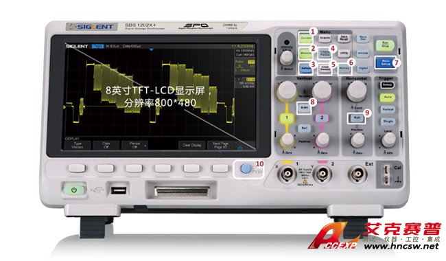 鼎陽SIGLENT SDS1102X+熒光示波器系列配備8英寸TFT-LCD顯示屏,分辨率800*480,把用戶最常用的功能做成了便捷化一鍵式操作,共計10種。