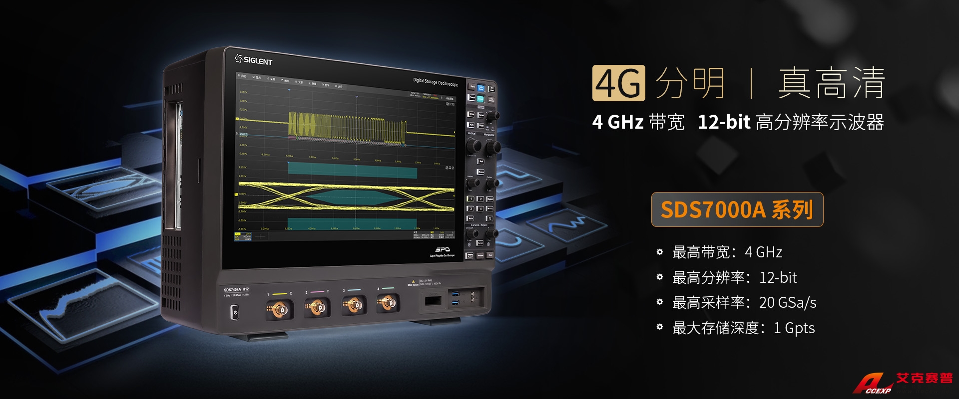 SDS7404A H12 | 4 GHz | 4 + EXT | 20 GSa/s (交織模式) | 100萬幀/秒 | 1 Gpts/ch | 12-bit |