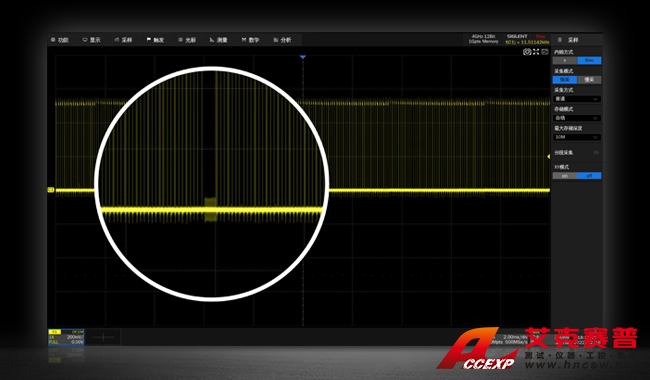根據(jù)奈奎斯特采樣定律,為了保證采樣后的數(shù)字信號能完整復(fù)原真實信號的信息,一般實際應(yīng)用中需要保證采樣率為信號最高頻率的2.56~4倍。SDS7204A H10示波器的采樣率最高達(dá)20 GSa/s,是最高帶寬的5倍,能完美避免因采樣率不足而導(dǎo)致的信號失真。再搭配上最大1 Gpts/通道的長存儲深度,在長時間捕獲波形的同時,依然能使用更高的采樣率高保真捕獲波形,充分發(fā)揮4GHz帶寬性能。