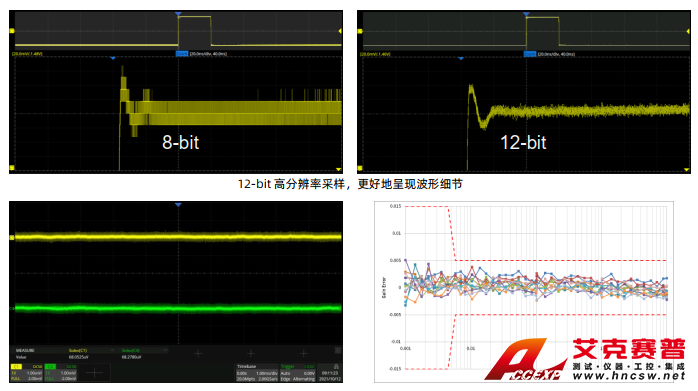 · 12-bit高分辨率ADC采樣,更好地呈現(xiàn)波形細節(jié)。相比于普通的8-bit示波器256級量化等級,12-bit示波器可達到4096級,是普通示波器的16倍,具備更小的量化誤差。