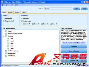 TekExpress SATA自動(dòng)一致性測(cè)試軟件-完整地為發(fā)送端和接收端提供支持SATA Gen1 和SATA Gen2 定義的測(cè)試集。使用TekExpress 軟件簡(jiǎn)單高效地 自動(dòng)執(zhí)行所有測(cè)試項(xiàng),可節(jié)約您大約70% 的一致性測(cè)試時(shí)間。同 時(shí),該軟件包含了自動(dòng)識(shí)別測(cè)試設(shè)備,準(zhǔn)確的DUT/Host 控制和一 鍵化測(cè)試功能。
