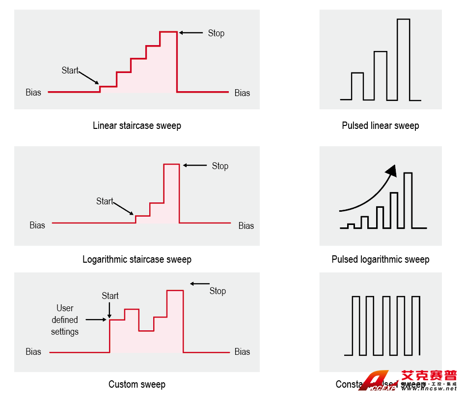 IT2805 SMU具備標準和列表LIST掃描功能。標準SWEEP模式下,支持線性和對數模式,單次和雙次掃描功能以及恒定和脈沖掃描功能。列表LIST掃描功能可以有效地執行任意波形輸出,在表征響應隨應用電壓或電流而變化的測試中非常有用,用戶可以使用Excel導入或面板編輯的方式,生成一個任意形狀的掃描曲線,最多可以導入99999點數據,是U-I和I-U特性測試的理想選擇。