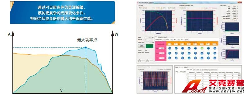 由于太陽能電池利用率不僅與其內(nèi)部特性有關(guān),還受到天氣、季節(jié)、溫度、照度、云遮、下雨和下雪等因素的影響,在不同的時段會具有不同的I-V特性。因此光伏逆變器必須具備應對策略,實時調(diào)整太陽能電池的工作點,使之始終工作在最大功率點附近,這一過程就稱之為最大功率點跟蹤MPPT。IT6000PV系列標配的太陽能電池矩陣仿真軟件可以在實驗室的測試環(huán)境下,去直接模擬各種真實條件下的太陽能電池陣列,從而測試光伏逆變器的靜態(tài) & 動態(tài)最大功率點追蹤效能。