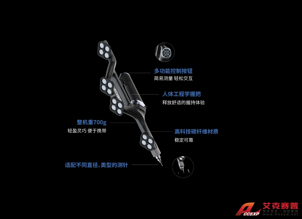 搭配測量光筆i-Probe,支持多測針適配,精準獲取基準孔、隱藏點等關鍵部位的三維數據,單點重復性可達0.025mm。