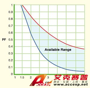 PF值的范圍會(huì)因設(shè)定的CF值而有所限制(如圖1所示)。此外,在63800系列的定義里,若設(shè)定的PF為正時(shí),則表示電流超前電壓 ; 反之,當(dāng)PF設(shè)定為負(fù)時(shí),則表示電流落后電壓。(見下圖)